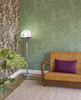 Vliesová tapeta s vinylovým povrchem, hrubá struktura plátna, motiv listů, stromů v odstínech zelené, fialové, hnědé a béžové.