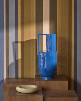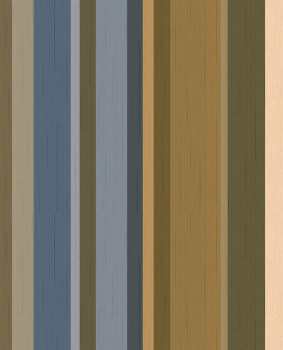 Vliesová tapeta s vinylovým povrchem, látková textura s pruhy v odstínech modré, šedé, hnědé.