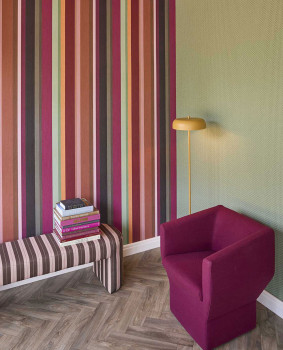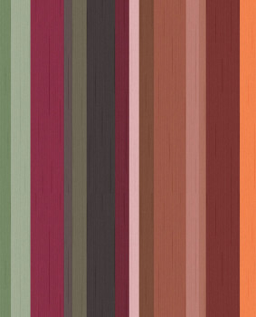 Vliesová tapeta s vinylovým povrchem, látková textura s pruhy v odstínech vínové, růžové, černé, hnědé, šedé a zelené.