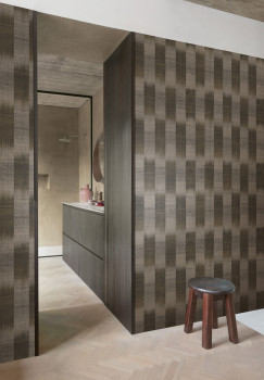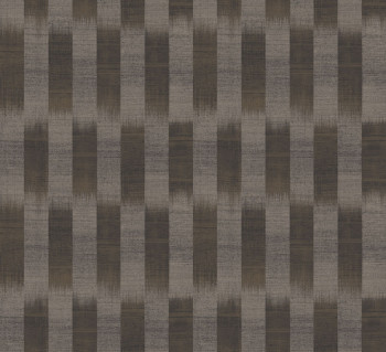 Vliesová tapeta s výraznou textilní strukturou a vertikálními pruhy v odstínech černé, hnědé a béžové barvy.