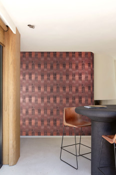 Vliesová tapeta s výraznou textilní strukturou a vertikálními pruhy v odstínech černé, oranžové, červené a hnědé barvy.