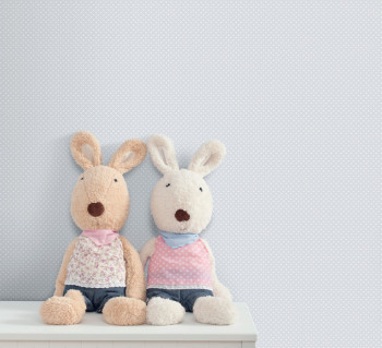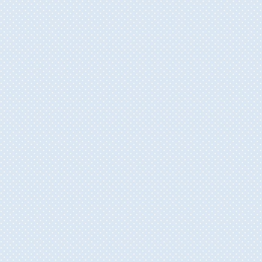 Papírová, dětská, světle modrá tapeta s drobným bílým puntíkem.