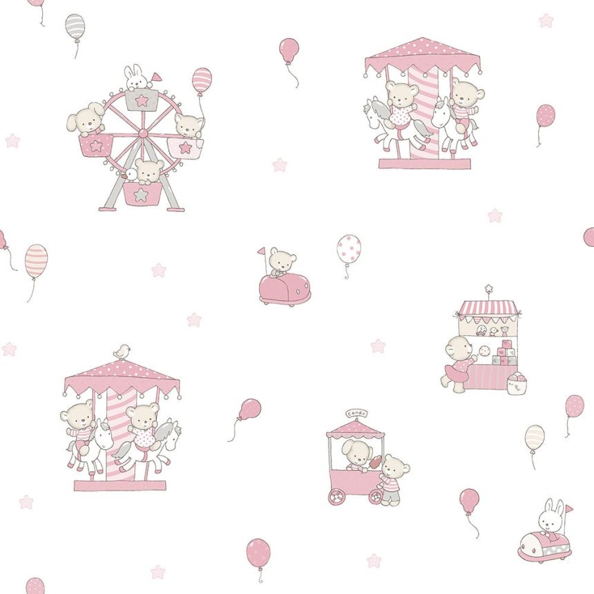 Papírová, světle růžová dětská tapeta s motivy pouti-zvířátek, balónků, hvězdiček a kolotočů.