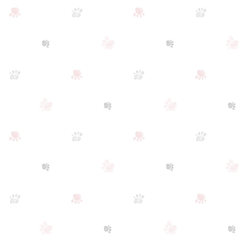 Papírová, dětská, bílá tapeta s otisky tlapek v odstínech růžové a šedé.