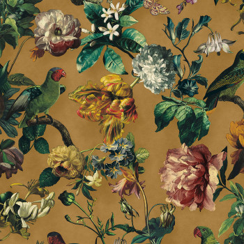 Vícebarevná luxusní tapeta s papoušky a květinami inspirovaná obrazy nizozemských malířů Zlatého věku.