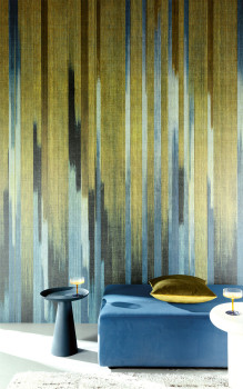 Vliesová obrazová tapeta na zeď, jemně plastická látková textura, pruhy, v odstínech modré, černé, limetkové a khaki zelené.
