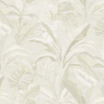 Luxusní vliesová tapeta s vinylovým povrchem, podklad vzhled hrubší textilii, pololesklý vzor listů evokuje výšivku v odstínech krémové a krémovo-zlaté.