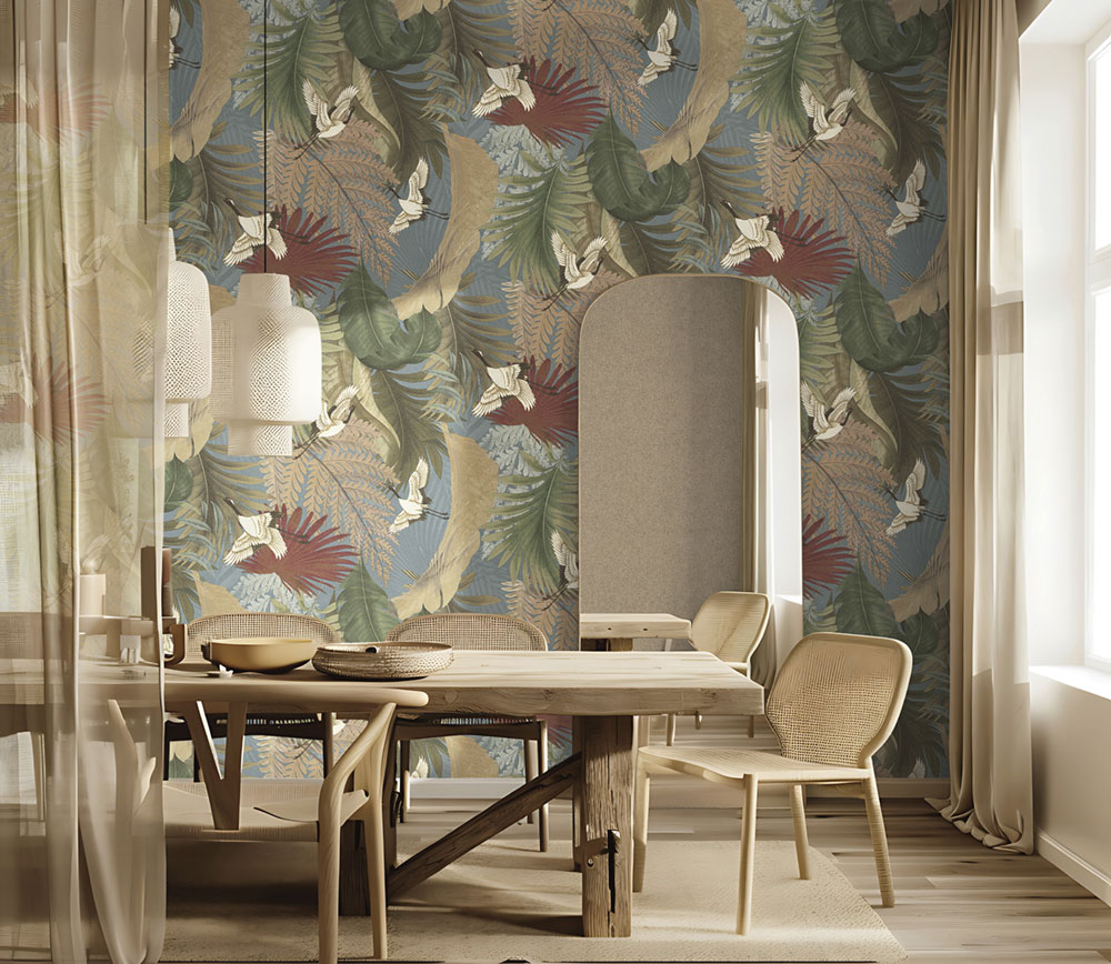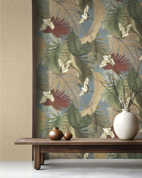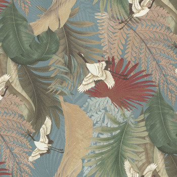 Luxusní vliesová tapeta s vinylovým povrchem, motiv listů a jeřábů v letu, odstíny modré, zelené, hnědé, vínové, místy zlatý pololesk.