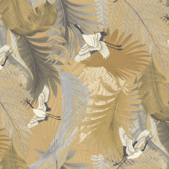 Luxusní vliesová tapeta s vinylovým povrchem, motiv listů a jeřábů v letu, odstíny zlaté, šedé a béžové.