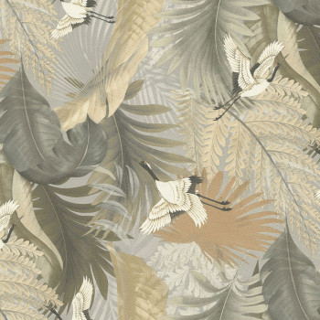 Luxusní vliesová tapeta s vinylovým povrchem, motiv listů a jeřábů v letu, odstíny šedé, hnědé, béžové, místy zlatý pololesk.