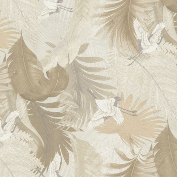 Luxusní vliesová tapeta s vinylovým povrchem, motiv listů a jeřábů v letu, odstíny krémové, béžové, šedé a hnědé.