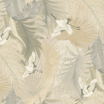Luxusní vliesová tapeta s vinylovým povrchem, motiv listů a jeřábů v letu, odstíny béžové a šedé.