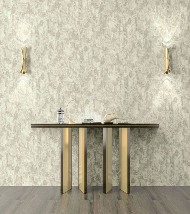 Vliesová, hnědobéžová tapeta s vinylovým povrchem. Imitace štukové omítky se zlatými metalickými odlesky.