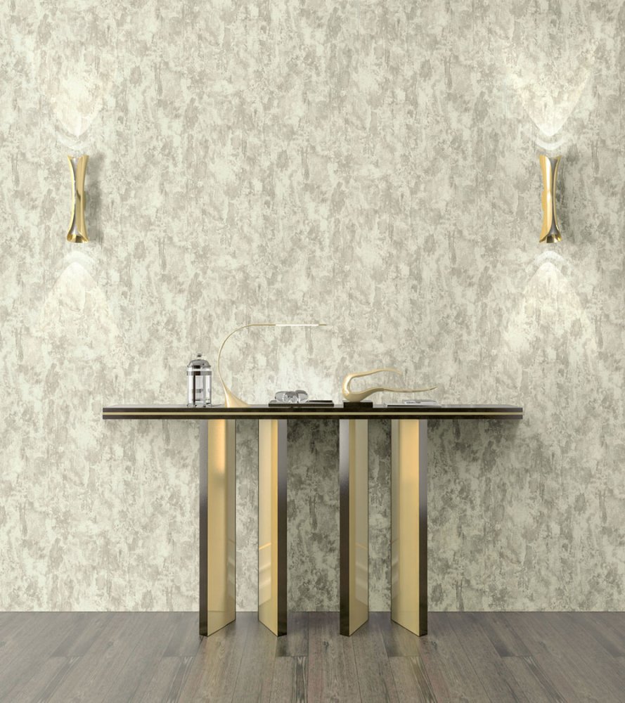 Vliesová, šedá tapeta s vinylovým povrchem. Imitace štukové omítky se zlatými metalickými odlesky.