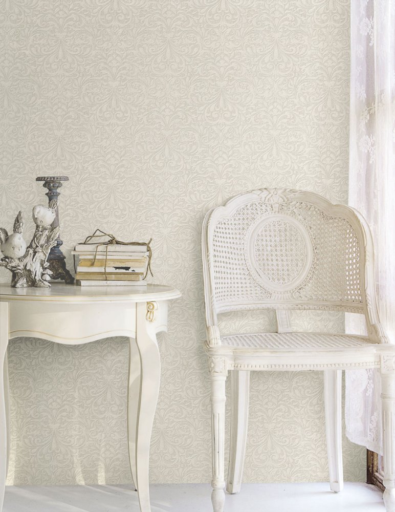Vliesová tapeta s vinylovým povrchem a látkovou texturou. Jemně plastický zámecký ornamentální vzor s jemnými odlesky.