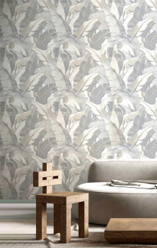 Luxusní vliesová tapeta s vinylovým povrchem, motiv listů v odstínech šedé a šedo-béžové, jemná látková textura.