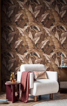 Luxusní vliesová tapeta s vinylovým povrchem, motiv listů v odstínech hnědé, jemná látková textura.