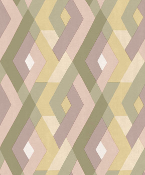 Luxusní vliesová tapeta s vinylovým povrchem, grafický vzor v odstínech zelené, fialové, růžové, béžové a okrové, jemná textura.
