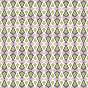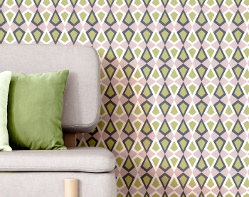 Luxusní vliesová tapeta s vinylovým povrchem, grafický vzor v odstínech lila, zelené, modré a bílé, jemná textura.