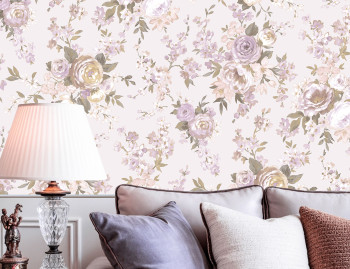 Luxusní vliesová tapeta s vinylovým povrchem, bledě fialkový podklad s látkovou texturou, květinový motiv v odstínech lila, khaki.