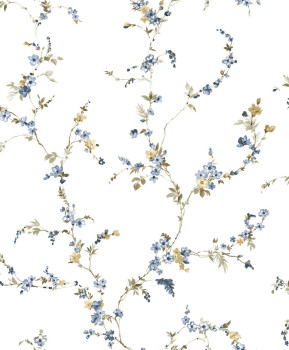 Luxusní vliesová tapeta s vinylovým povrchem, bílý podklad s látkovou texturou, květinový motiv v odstínech modré, khaki a hnědé.