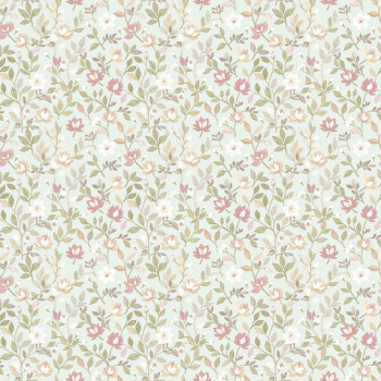 Luxusní vliesová tapeta s vinylovým povrchem, bledě zelený podklad, květinový motiv v odstínech starorůžové, zelené a okrové.