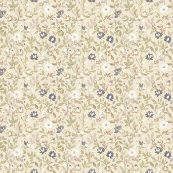 Luxusní vliesová tapeta s vinylovým povrchem, béžový podklad, květinový motiv v odstínech modré, zelené a okrové.