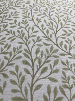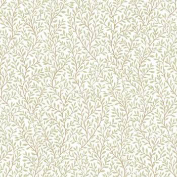 Luxusní vliesová tapeta s vinylovým povrchem, látková textura, smetanově bílý podklad, motiv větviček s listy, odstíny zelené a hnědé.
