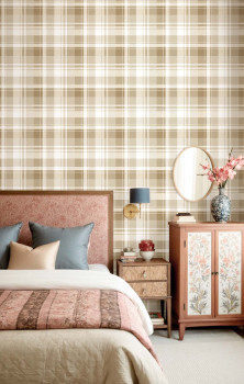 Luxusní vliesová tapeta s vinylovým povrchem, látková textura, vzor evokuje tartanovou látku v béžových odstínech.