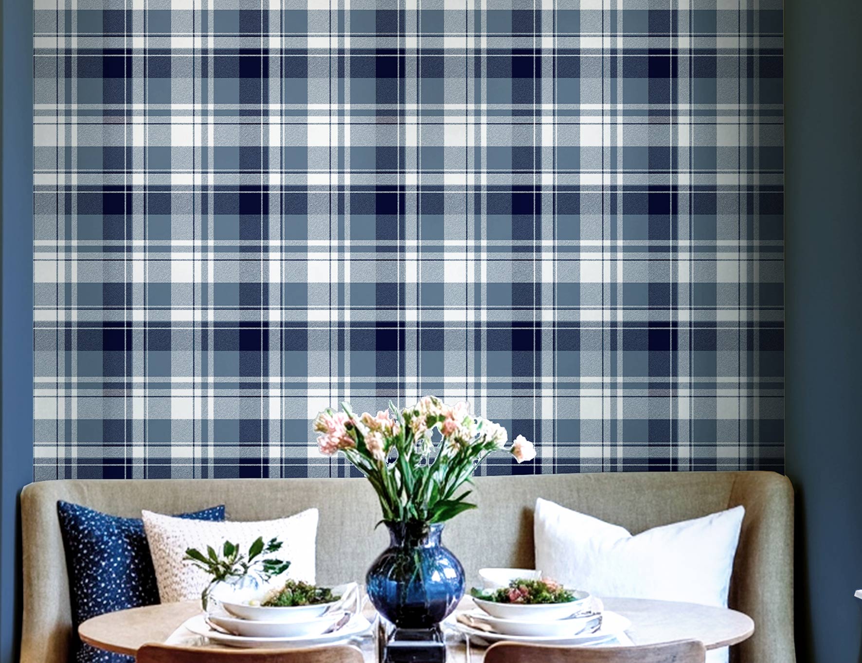 Luxusní vliesová tapeta s vinylovým povrchem, látková textura, vzor evokuje tartanovou látku v modrých odstínech.