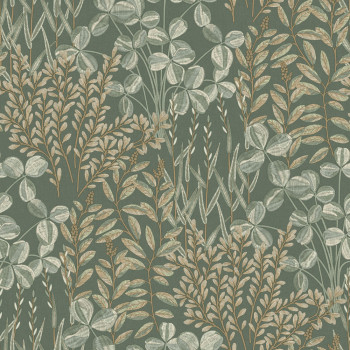 Vliesová tapeta s vinylovým povrchem, motiv lučních trav a listů v odstínech zelené a béžové, zlaté stonky a detaily.