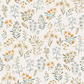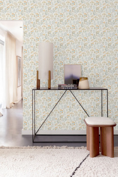 Vliesová tapeta s vinylovým povrchem, motiv květin v odstínech modré, béžové, hnědé a šedé, jemná textura.