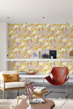 Vliesová tapeta s vinylovým povrchem, motiv pestrých květin, odstíny oranžové, fialové, červené a zelené, jemná textura.