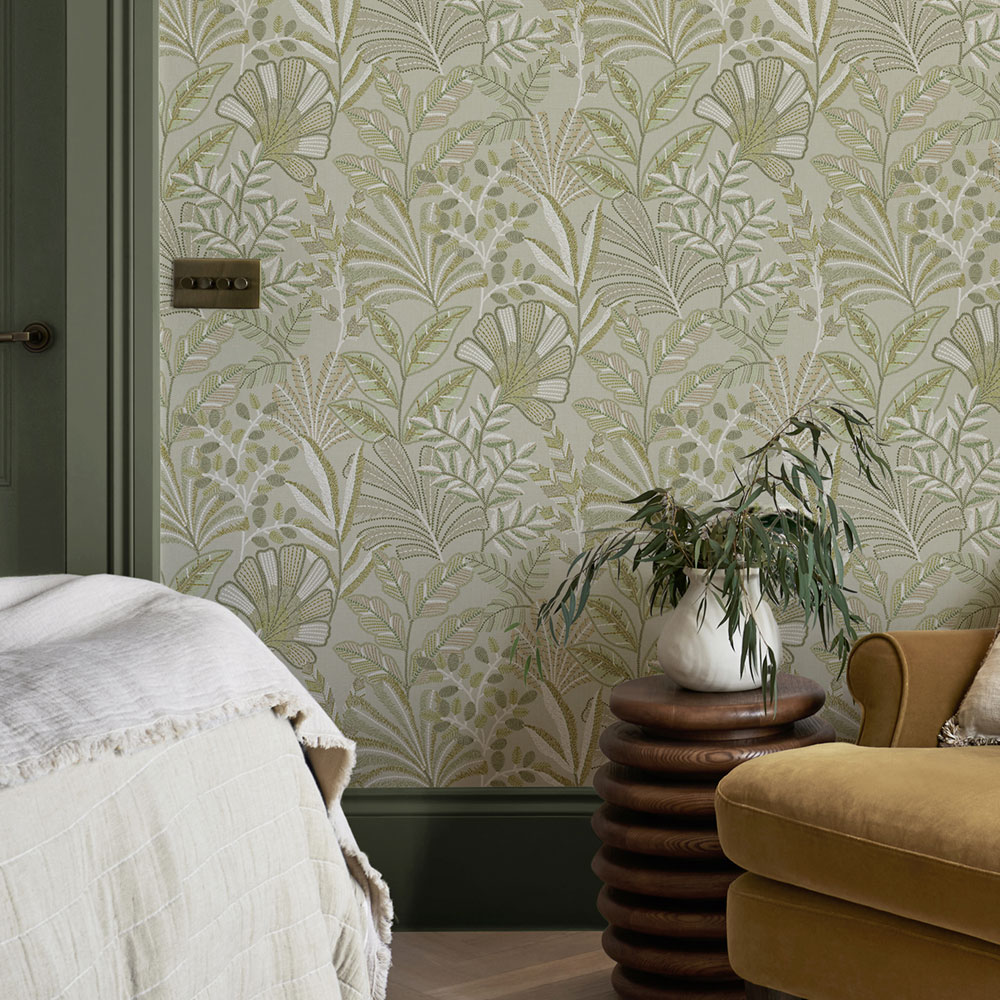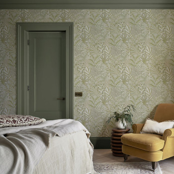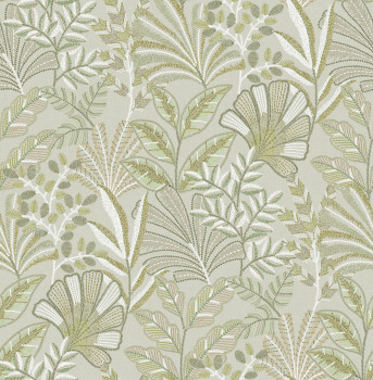 Vliesová tapeta na zeď, design inspirovaný výšivkami, odstíny zelené.