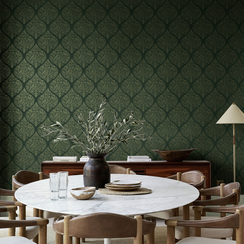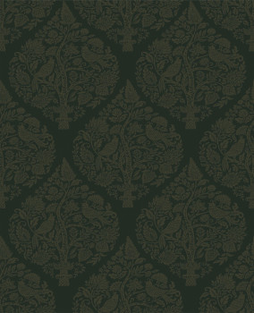 Vliesová tapeta na zeď, matný tmavě zelený podklad, pololesklý zlatý ornamentální vzor s rostlinami a ptáčky.