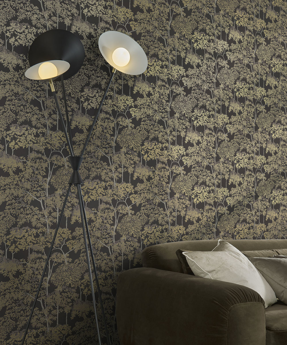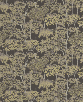 Vliesová tapeta na zeď, matný tmavě hnědý podklad, stromy s pololesklými zlatými listy a šedo-stříbrnými kmeny.