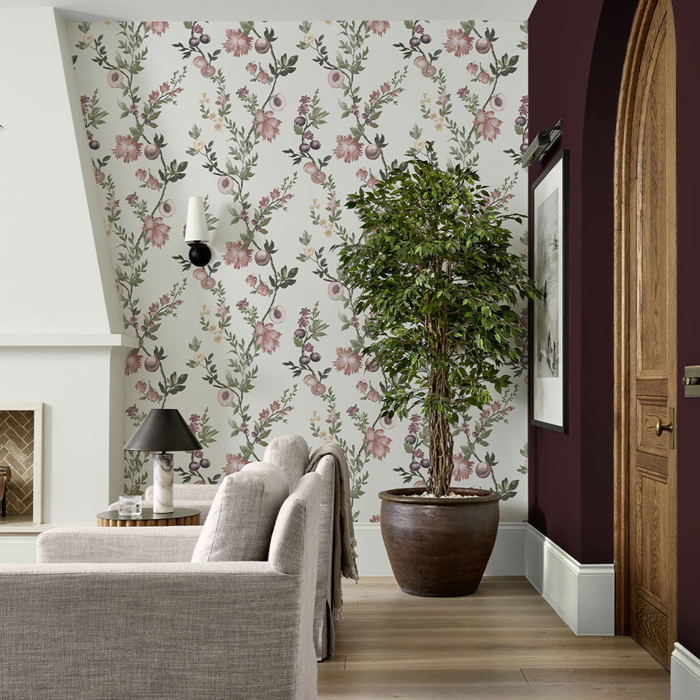 Vliesová tapeta na zeď, teplý bílý podklad s nádechem do šedo-zelena, větvičky s květinami a ovocem v odstínech zelené, růžové a švestkové.