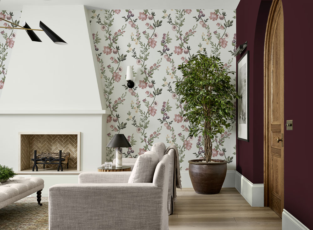 Najdete zde výrazné květinové motivy od drobných kvítků na tmavém podkladu, které působí odvážně, elegantně a trochu podmanivě, až po jemnější varianty na světlém pozadí. Krásným prvkem jsou větve broskvoní a dalších ovocných stromů plné květů i plodů, které dodávají tapetám přirozenost, svěžest a romantickou atmosféru.