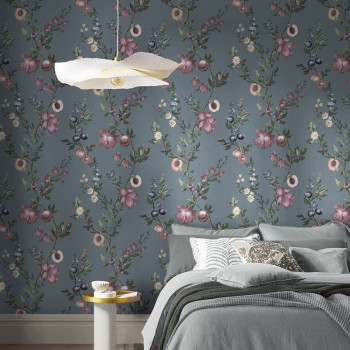 Vliesová tapeta na zeď, modrý podklad, větvičky s květinami a ovocem.
