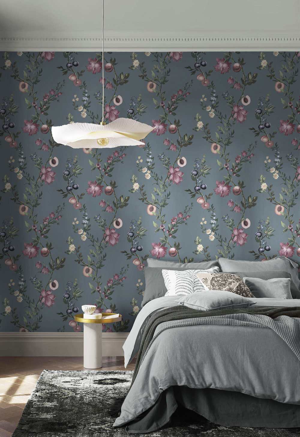 Najdete zde výrazné květinové motivy od drobných kvítků na tmavém podkladu, které působí odvážně, elegantně a trochu podmanivě, až po jemnější varianty na světlém pozadí. Krásným prvkem jsou větve broskvoní a dalších ovocných stromů plné květů i plodů, které dodávají tapetám přirozenost, svěžest a romantickou atmosféru.