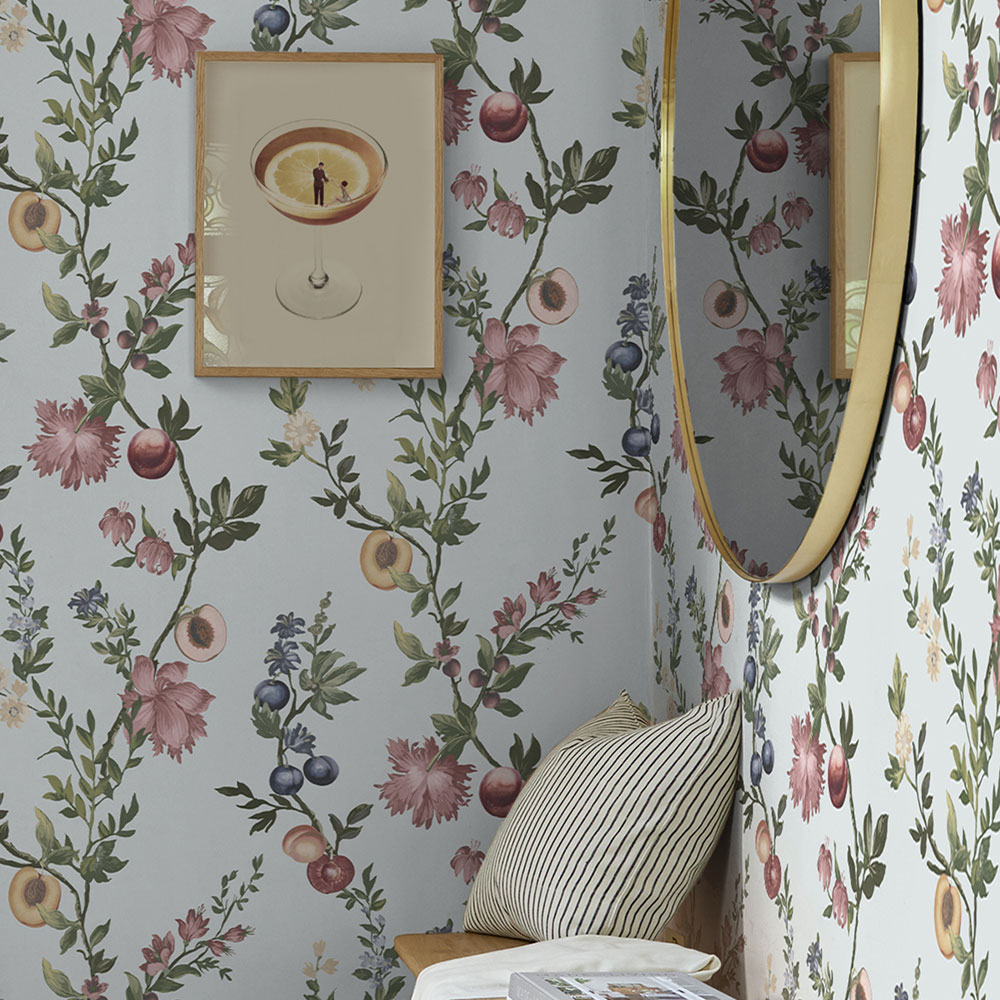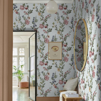 Vliesová tapeta na zeď, světle modrý podklad, větvičky s květinami a ovocem.