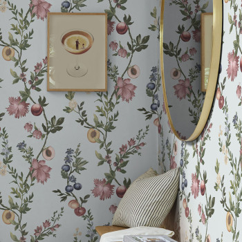 Najdete zde výrazné květinové motivy od drobných kvítků na tmavém podkladu, které působí odvážně, elegantně a trochu podmanivě, až po jemnější varianty na světlém pozadí. Krásným prvkem jsou větve broskvoní a dalších ovocných stromů plné květů i plodů, které dodávají tapetám přirozenost, svěžest a romantickou atmosféru.