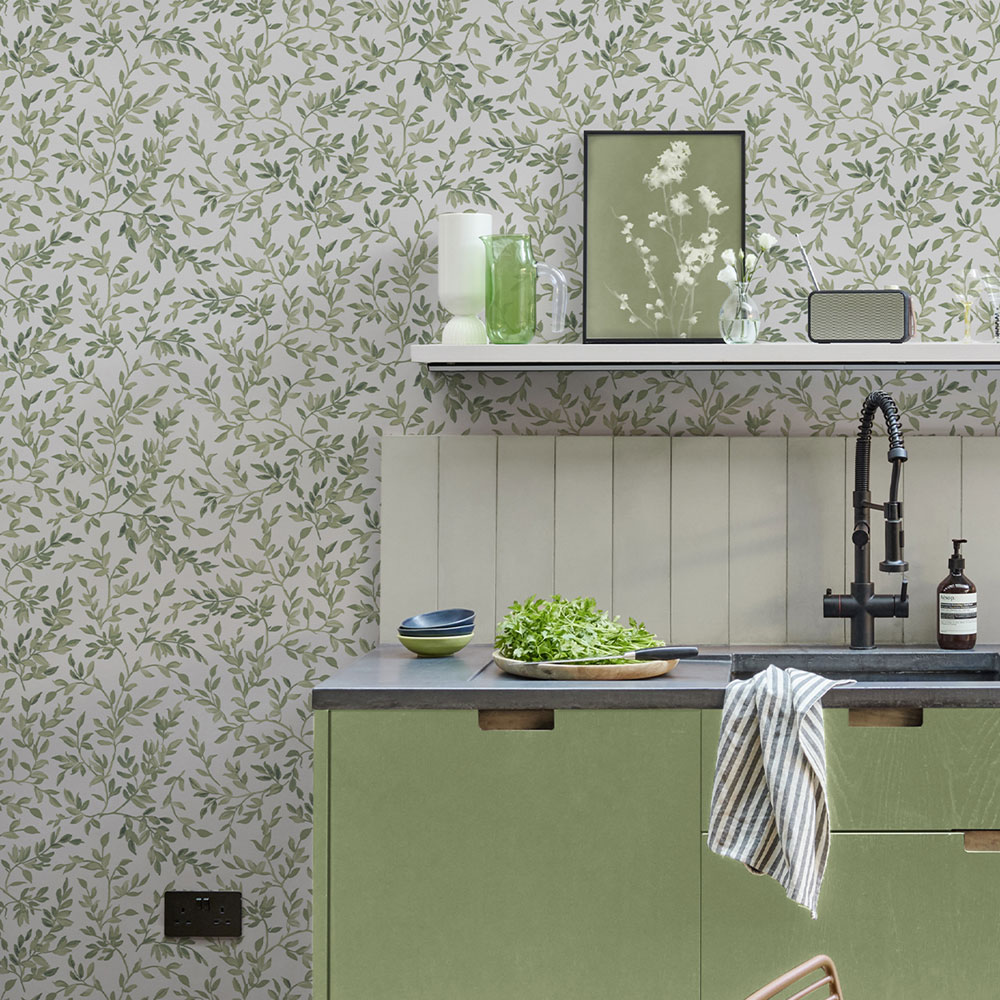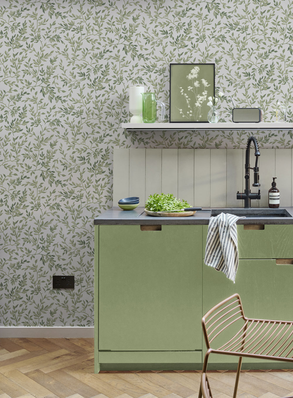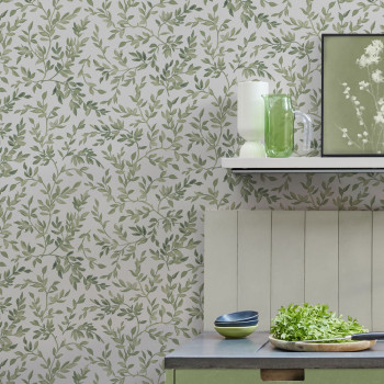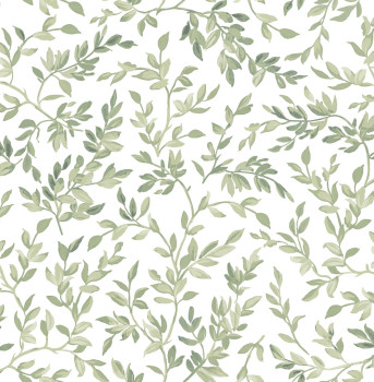 Vliesová tapeta na zeď, bílý podklad, motiv větviček s listy v odstínech zelené.