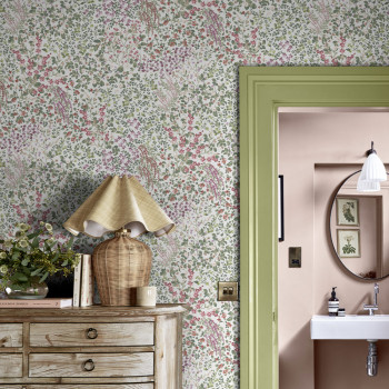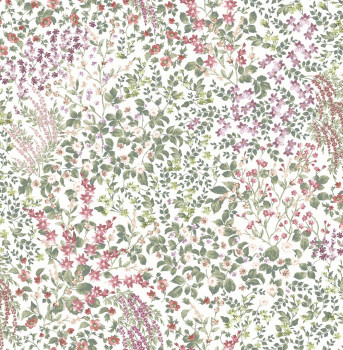 Vliesová tapeta na zeď, bílý podklad, květinový vzor v odstínech zelené, růžové, červené, lila.