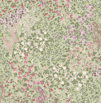 Vliesová tapeta na zeď, zelený podklad, květinový vzor v odstínech zelené, růžové a fialové.