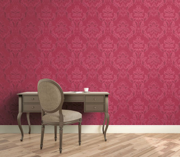 Vinylová, malinová tapeta s damaškovým vzorem.