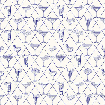 Luxusní vliesová obrazová tapeta na zeď s vinilovým povrchem, drinky, bílý podklad s modrými konturami pruhů, modré obrysy skleniček s nápoji.