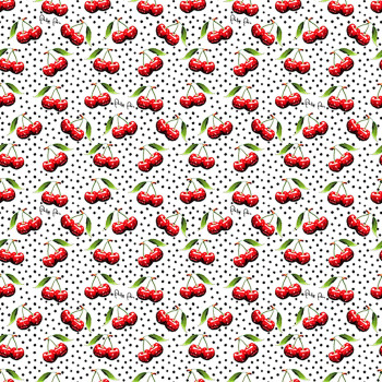 Luxusní vliesová obrazová tapeta na zeď s vinilovým povrchem, plody třešní, bílý podklad s černými puntíky, červeno zelené třešně.