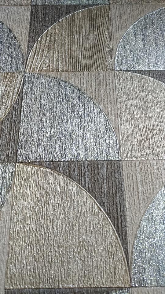 Vliesová, hnědo-zlatá tapeta s geometrickým vzorem s jemnými zlatými třpytkami.