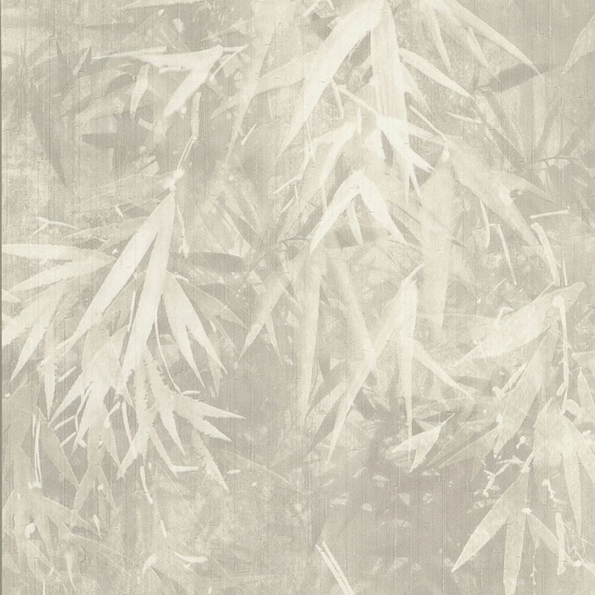 Vliesová, šedá tapeta s listy, stříbřitý pololesk.